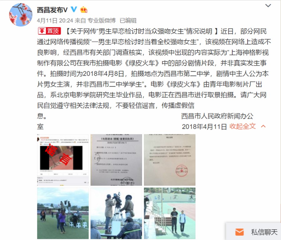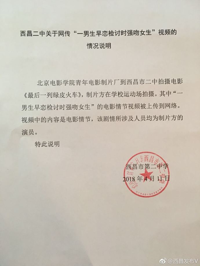 4月11日,西昌市政府新聞辦官微“西昌發(fā)布”發(fā)表對該視頻的情況說明。經(jīng)查,該視頻中出現(xiàn)的內(nèi)容實際為“上海一影視制作有限公司在西昌市拍攝某電影中的部分劇情片段,并非真實發(fā)生事件。拍攝時間為2018年4月8日,拍攝地點為西昌市第二中學(xué),劇情中主人公為本片男女主演,并非西昌市二中學(xué)學(xué)生”。并附圖“北京市新聞出版廣電局《電影劇本〈梗概〉備案回執(zhí)單》”、“西昌二中關(guān)于網(wǎng)傳‘一早戀男生檢討時強吻女生’視頻的情況說明”及在操場取景拍攝的照片。