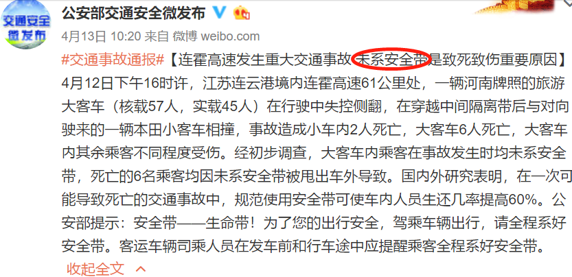 4月12日下午,江蘇連云港境內連霍高速61公里處,一輛河南牌照的旅游大客車在行駛中失控側翻,在穿越中間隔離帶后與對向駛來的一輛本田小客車相撞,事故造成小車內2人死亡,大客車6人死亡,大客車內其余乘客不同程度受傷。經初步調查,大客車內乘客在事故發(fā)生時均未系安全帶,死亡的6名乘客均因未系安全帶被甩出車外導致。