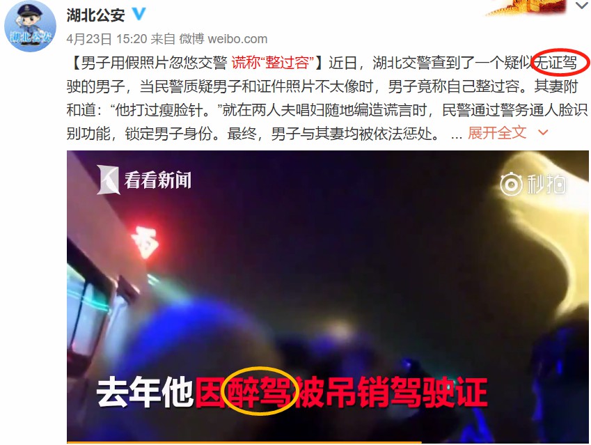 據(jù)“湖北公安”4月23日稱,近日,湖北交警查到了一個疑似無證駕駛的男子,當民警質疑男子和證件照片不太像時,男子竟稱自己整過容。其妻附和道:“他打過瘦臉針!本驮趦扇朔虺獘D隨地編造謊言時,民警通過警務通人臉識別功能,鎖定男子身份。該男子去年因醉駕被吊銷駕駛證,最終,男子與其妻均被依法懲處。