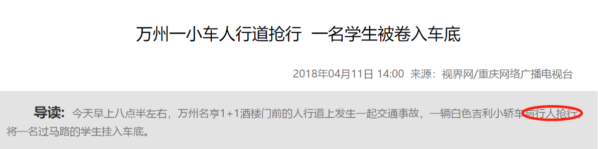 4月11日,重慶市萬州區(qū)某酒樓門前的人行道上發(fā)生一起交通事故,一輛白色吉利小轎車與行人搶行,將一名過馬路的學生掛入車底。眾人將汽車抬起后,受傷兒童被救出并送往三峽中心醫(yī)院搶救。