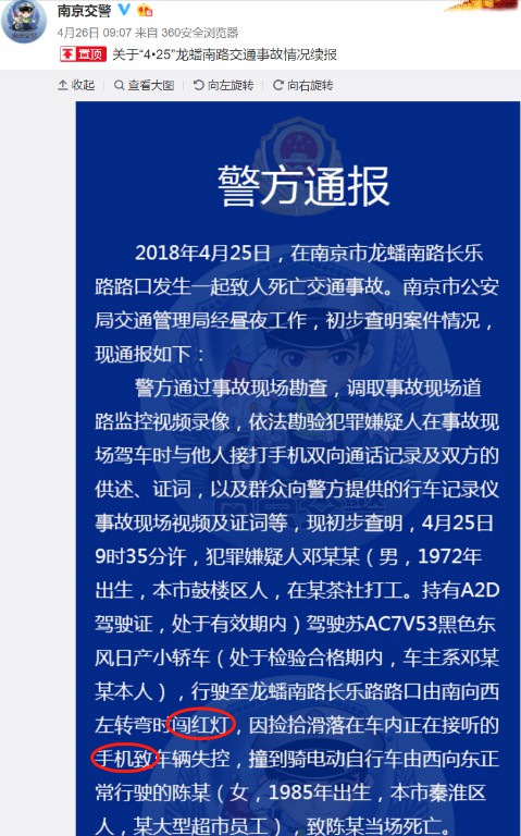 2018年4月25日,在江蘇省南京市發(fā)生一起致人死亡交通事故。經警方調查,犯罪嫌疑人鄧某某駕駛某小轎車行駛至龍蟠南路長樂路路口由南向西左轉彎時闖紅燈,因撿拾滑落在車內正在接聽的手機致車輛失控,撞到騎電動自行車由西向東正常行駛的陳某,致陳某當場死亡。