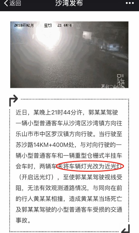 據(jù)“沙灣發(fā)布”4月26日報道,近日,某晚上21時44分許,郭某某駕駛一輛小型普通客車從四川省樂山市沙灣區(qū)沙灣鎮(zhèn)方向往樂山市市中區(qū)羅漢鎮(zhèn)方向行駛。當行駛至蘇沙路14KM+400M處,與對向行駛的一輛小型普通客車和一輛重型倉柵式半掛車會車時,兩輛車未將車輛燈光改為近光燈(開啟遠光燈),至使郭某某駕駛視線受阻,無法有效觀測道路情況,與同向在前的行人黃某某相撞,造成黃某某當場死亡及郭某某駕駛的小型普通客車受損的交通事故。