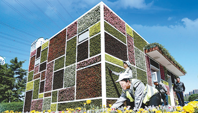 5月3日,北京市豐臺(tái)區(qū)花鄉(xiāng)草橋村環(huán)衛(wèi)工人們正在對(duì)新建成的“花房式公廁”進(jìn)行管護(hù)。為提升公廁服務(wù)品質(zhì),以花卉為主導(dǎo)產(chǎn)業(yè)的草橋村將綠色、衛(wèi)生和美觀的理念融入到公廁的建設(shè)之中,該公廁的四邊外墻和房頂均由綠雕墻構(gòu)成,從側(cè)面看整個(gè)房子像是五顏六色的大魔方。