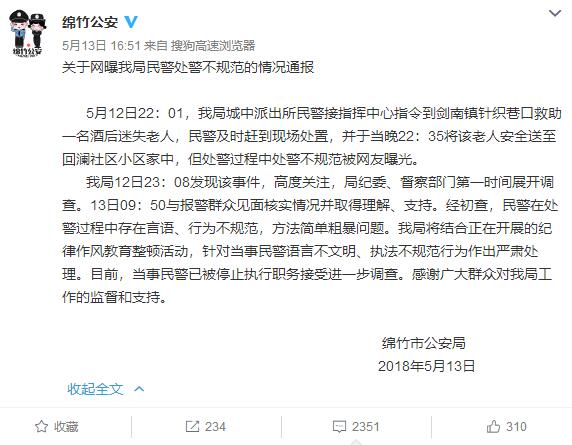 5月13日下午,綿竹市公安局官方微博對(duì)此事進(jìn)行了通報(bào):5月12日22:01,綿竹市公安局城中派出所民警接指揮中心指令到劍南鎮(zhèn)針織巷口救助一名酒后迷失老人,民警及時(shí)趕到現(xiàn)場(chǎng)處置,并于當(dāng)晚22:35將該老人安全送至回瀾社區(qū)小區(qū)家中,但處警過(guò)程中處警不規(guī)范被網(wǎng)友曝光。