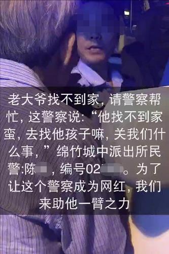 這段9秒長(zhǎng)的視頻開頭以醒目的字幕顯示“老大爺找不到家,請(qǐng)警察幫忙,這警察說(shuō):‘他找不到家,去找他孩子嘛,關(guān)我們什么事,’綿竹城中派出所民警:陳某,編號(hào)02***。為了讓這個(gè)警察成為網(wǎng)紅,我們來(lái)助他一臂之力”。從視頻中,可以看出當(dāng)時(shí)是夜晚,一位老人雙手在胸前,手指交叉相握,向坐在警車?yán)锩娴囊晃幻窬笾5撁窬Q:“本身找人就不該我們找”。接著,旁邊的一位女士對(duì)該民警說(shuō),這個(gè)老大爺找不到家了,你們可不可以幫一下。該民警打斷女士的話稱,老大爺找不到家可以找他兒子,關(guān)我們啥子事。接著,該民警用右手直接用力拍向鏡頭。