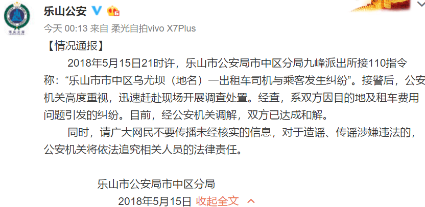 出租司機(jī)欲將女乘客拉往偏僻地?樂(lè)山警方:糾紛已和解