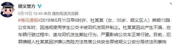 5月15日午間,北京市順義區(qū)警方發(fā)布了情況通報(bào)。5月11日早6時(shí)許,35歲的順義區(qū)女子杜某某在乘順13路公交車(chē)時(shí),因違規(guī)使用學(xué)生公交卡被司機(jī)發(fā)現(xiàn)并制止。杜某某因此產(chǎn)生不滿,在車(chē)輛行駛過(guò)程中,遂與司機(jī)發(fā)生撕扯行為,嚴(yán)重影響公交車(chē)正常行駛。目前,犯罪嫌疑人杜某某因涉嫌以危險(xiǎn)方法危害公共安全罪被順義公安分局依法刑事拘留。
