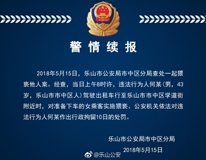 5月15日18時(shí),四川樂山警方發(fā)布警情續(xù)報(bào),2018年5月15日,樂山市公安局市中區(qū)分局查處一起猥褻他人案。經(jīng)查,當(dāng)日上午8時(shí)許,違法行為人樂山市市中區(qū)何某,其駕駛出租車行至樂山市市中區(qū)學(xué)道街附近時(shí),對(duì)準(zhǔn)備下車的女乘客實(shí)施猥褻。公安機(jī)關(guān)依法對(duì)違法行為人何某作出行政拘留10日的處罰。