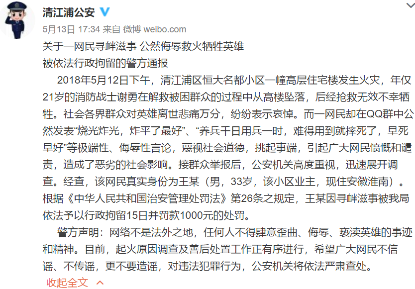 清江浦警方聲明:網(wǎng)絡(luò)不是法外之地,任何人不得肆意歪曲、侮辱、褻瀆英雄的事跡和精神。目前,起火原因調(diào)查及善后處置工作正有序進(jìn)行,希望廣大網(wǎng)民不信謠、不傳謠,更不要造謠,對(duì)違法犯罪行為,公安機(jī)關(guān)將依法嚴(yán)肅查處。