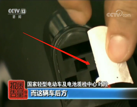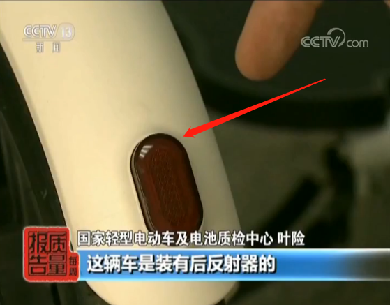 國家輕型電動(dòng)車及電池質(zhì)檢中心 葉險(xiǎn):我們可以看到這輛車,這輛車是裝有后反射器的,所以它可以使得后方的機(jī)動(dòng)車發(fā)現(xiàn)它。而這輛車它后方其實(shí)是沒有反射器的,我們看這個(gè)好像是疑似反射器,但它僅僅只是一張貼紙,我們一次就可以把它撕下來,它是起不到任何反射作用。所以這輛車的話,是沒有保證它的騎行者的安全的。