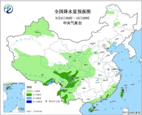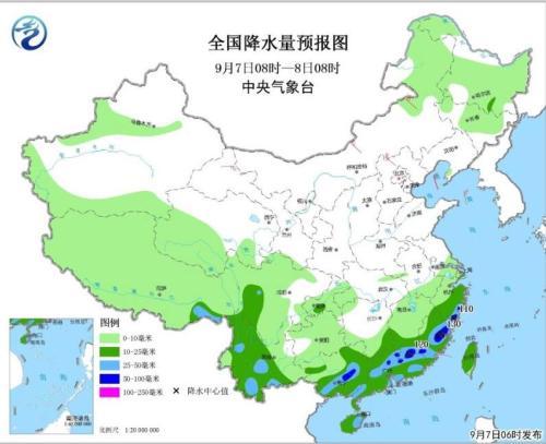 9月7日08時(shí)至8日08時(shí),內(nèi)蒙古東北部、東北部地區(qū)中北部、新疆沿天山地區(qū)、青藏高原大部、西南地區(qū)大部、江南大部、華南和臺(tái)灣島等地有小到中雨或雷陣雨,其中,江南東南部、華南和云南中西部等地的部分地區(qū)有大雨,局地有暴雨或大暴雨(100~130毫米)(見圖1),并伴有短時(shí)強(qiáng)降水、雷暴大風(fēng)或冰雹等強(qiáng)對(duì)流天氣。甘肅西北部、內(nèi)蒙古中部、華北北部、山東東部、遼寧南部等地有4~6級(jí)風(fēng)。