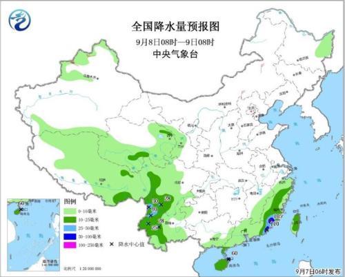 圖1 全國降水量預(yù)報(bào)圖(9月7日08時(shí)-8日08時(shí))