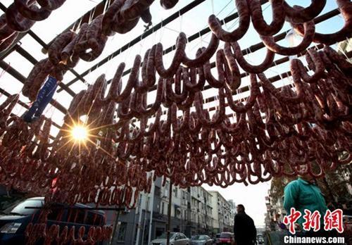 資料圖:“小雪”時(shí)節(jié) 南京街頭香腸成串。泱波 攝
