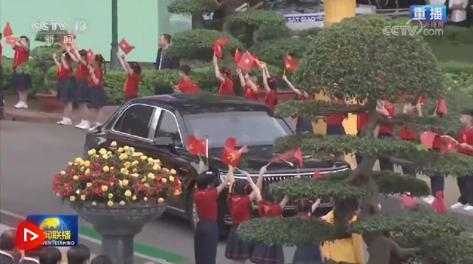 四月的河內,林木蔥郁,生機盎然。主席府廣場上,五星紅旗同金星紅旗迎風飄揚,200多名越南少年兒童揮舞旗幟,熱烈歡迎習近平到訪。