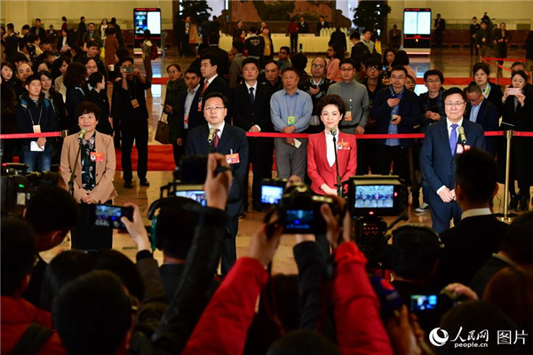 全國政協(xié)十三屆二次會議首場委員通道于3月3日14:00在人民大會堂一層中央大廳北側舉行。9位全國政協(xié)委員接受記者采訪。人民網記者 于凱 攝……