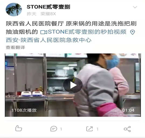 11月6日14:50,“西安直播”等微博號轉(zhuǎn)發(fā)網(wǎng)友爆料:“11月5號,在西安市某醫(yī)院食堂內(nèi),清潔人員站在灶臺上在打掃油煙機上的污漬時,竟直接把清潔油煙機的拖把放到灶臺上的鍋里清洗,絲毫不避諱外面的食客。目前,餐廳方面對此還未作出回應(yīng)!贝艘曨l同時被“新浪財經(jīng)”、“深圳商報”等多個媒體官微點名轉(zhuǎn)發(fā)。