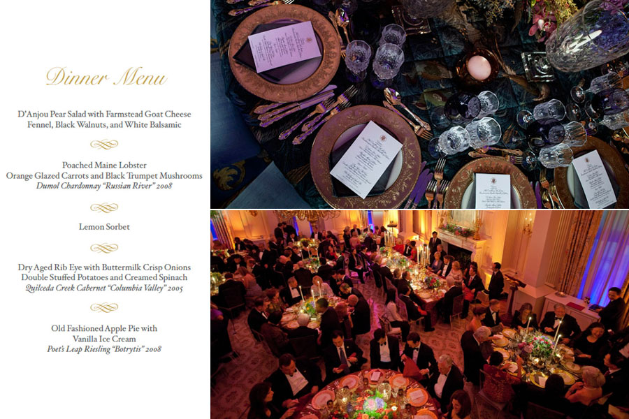 本次晚宴主打菜肴包括水煮緬因州龍蝦、脫脂乳酥洋蔥配干式熟成肋眼牛排等,甜點包括蘋果派和香草冰淇淋;酒是2008年產的“俄國河”酒和2005年產的“哥倫比亞峽谷”酒。