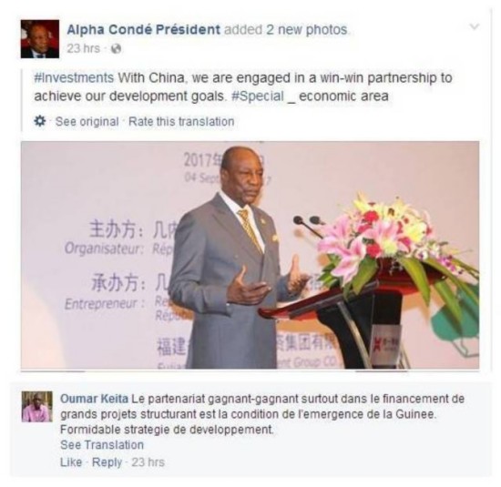 年近八旬的幾內(nèi)亞總統(tǒng)孔戴也在臉譜上記錄下自己的中國之行。他在一條貼文中寫道:“我們與中國開展雙贏合作,以實現(xiàn)我們的發(fā)展目標”。