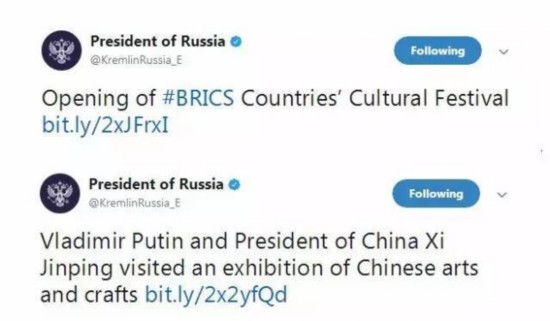 克里姆林宮推特官方賬號則發(fā)了兩條關(guān)于俄羅斯總統(tǒng)普京出席文化交流活動的推文,分別是普京參加金磚國家文化節(jié)和中國藝術(shù)品展。人文交流是此次廈門會晤上推進金磚合作的一大新支柱。