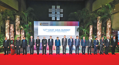 | 11月14日,國務院總理李克強在菲律賓國際會議中心出席第十二屆東亞峰會。這是會議前,李克強同出席會議的東盟十國領導人以及韓國總統(tǒng)文在寅、俄羅斯總理梅德韋杰夫、日本首相安倍晉三、印度總理莫迪、澳大利亞總理特恩布爾、新西蘭總理阿德恩、美國國務卿蒂勒森合影。 |