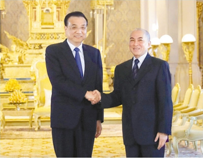 國務(wù)院總理李克強(qiáng)當(dāng)?shù)貢r(shí)間1月11日中午在金邊王宮會(huì)見柬埔寨國王西哈莫尼。