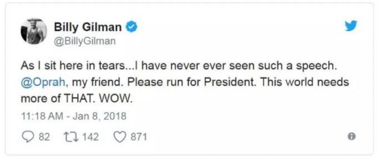 Billy Gilman:我現(xiàn)在坐在這兒淚流滿面……我從來(lái)沒(méi)聽過(guò)這樣的演講,奧普拉,我的朋友,請(qǐng)競(jìng)選總統(tǒng)吧,這個(gè)世界需要更多這樣的聲音。