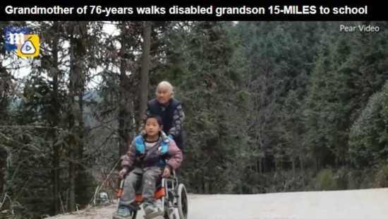 英國(guó)《每日郵報(bào)》1月22日發(fā)表文章,關(guān)注中國(guó)廣西76歲老太史玉英的感人故事。老人每天都會(huì)步行24公里的路,用一把破舊的輪椅推著患腦癱的孫子上學(xué)。報(bào)道稱,她“4年如一日,風(fēng)雨無(wú)阻,意志堅(jiān)強(qiáng)!
