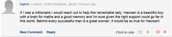 英國(guó)倫敦的網(wǎng)友bigben表示:“如果我能再有錢(qián)一些的話,我一定會(huì)幫助這位偉大的女士的。蔣昊文是個(gè)非常聰明的孩子,擅長(zhǎng)數(shù)學(xué),過(guò)目不忘。他如果能夠有更多的幫助,必定能在世上有所作為。常言說(shuō),‘每個(gè)成功的男人背后都有個(gè)偉大的女人’,昊文背后偉大的女人就是他的奶奶!