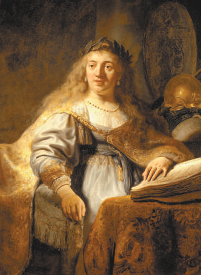 在《穿金邊斗篷的少女》這幅作品中,為了凸顯對明暗光影效果的處理能力,畫中人身著黑色斗篷,連同灰黑的背景,大面積的暗部將作為重點(diǎn)的人物面部烘托出來,宛若聚光式的映照,透過少女面部精致的五官,觀眾仿佛感受到了正款款流出的情思。在倫勃朗筆下,美不再僅僅是對漂亮容顏的寫真,光影之間,鮮活的人物個(gè)性塑造才是其孜孜以求的關(guān)鍵,成為最打動人心的地方,畫布里充滿被欣賞的氣氛。而他少有的歷史畫作,也無不彰顯其過人的天資。在《書房中的女神密涅瓦》中,老到而精煉的技法、逼真的物象處理、和諧的光影關(guān)系等,很難讓人相信這幅巨作出自年僅29歲的倫勃朗之手。