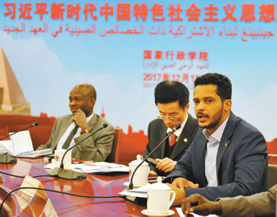 習(xí)近平新時代中國特色社會主義思想、人類命運共同體、反腐斗爭、精準扶貧、“一帶一路”……2017年歲末,20位蘇丹政府部級官員來到中國參加國家行政學(xué)院的培訓(xùn)交流。黨的十九大規(guī)劃了中國從現(xiàn)在到本世紀中葉的發(fā)展藍圖,宣示了中方愿同各方推動構(gòu)建人類命運共同體的真誠愿望。蘇丹政府決策者們希望更加深入地理解中國和中國共產(chǎn)黨,學(xué)習(xí)借鑒中國經(jīng)驗和中國智慧,解讀中國共產(chǎn)黨的“執(zhí)政密碼”