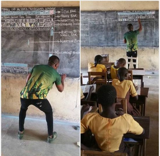 據(jù)英國《每日郵報》3月1日報道,近日,一位加納中學(xué)老師在臉書上分享的“獨門”教學(xué)照片帖子走紅網(wǎng)絡(luò)。據(jù)悉,由于他所任教的中學(xué)沒有電腦設(shè)備,所以他只能使用彩色粉筆不辭辛苦地將電腦屏幕的一個個頁面繪制到黑板上進(jìn)行教學(xué)。他給學(xué)生在黑板上畫圖講解如何使用微軟Word的照片發(fā)出后,這位老師獲得了全球的贊譽。