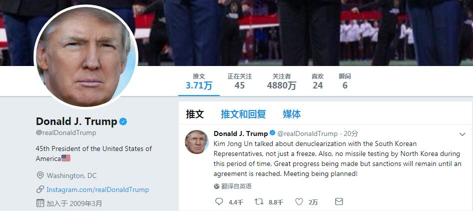 特朗普8日發(fā)推特說,開始計劃會晤。