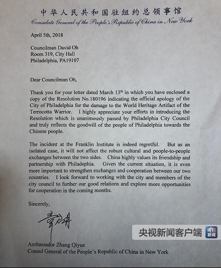 目前,這份書面道歉決議已經(jīng)正式呈交中國駐紐約總領(lǐng)事章啟月,得到了中方的書面回復(fù),并于當(dāng)?shù)貢r(shí)間4月5日轉(zhuǎn)呈陜西省文物交流中心。(央視記者 王萌 王風(fēng)華)