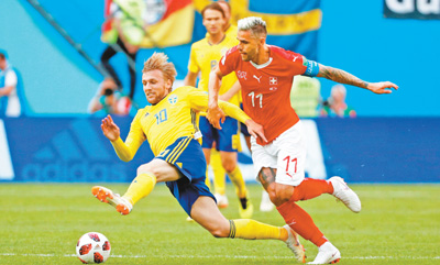 當?shù)貢r間7月3日,瑞典隊球員福斯貝里(前左)和瑞士隊球員貝赫拉米(前右)在比賽中拼搶。58A安康新聞網(wǎng)