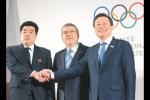 圖為1月20日,韓國代表團團長都鐘煥(右)和朝鮮代表團團長金一國在國際奧委會主席巴赫(中)主持的歡迎儀式上握手。……