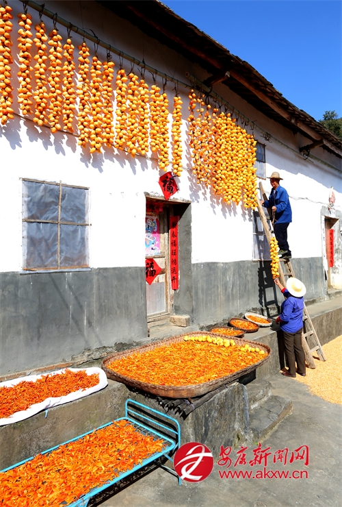 鄉(xiāng)親們趁著柿子還沒(méi)軟就采摘下來(lái),在房前屋后搭起一排排晾曬柿餅的木架,開(kāi)始每年一次的傳統(tǒng)手工勞作:去皮、懸掛、晾曬。出霜后就成了美味的柿餅。