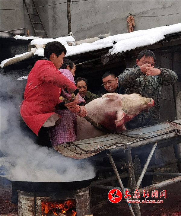 時(shí)逢陰歷十月初九,鎮(zhèn)坪縣迎來(lái)了入冬以來(lái)第一場(chǎng)降雪。漫天大雪,給原本氣溫偏低的化龍山腳下的張家坪增添了寒冷。然而,上竹鎮(zhèn)化龍村8組村民張成凱和叔叔張秀柱,卻帶著家人熱火朝天地忙著殺豬腌制臘肉,絲毫沒(méi)有寒冷的感覺(jué)。
